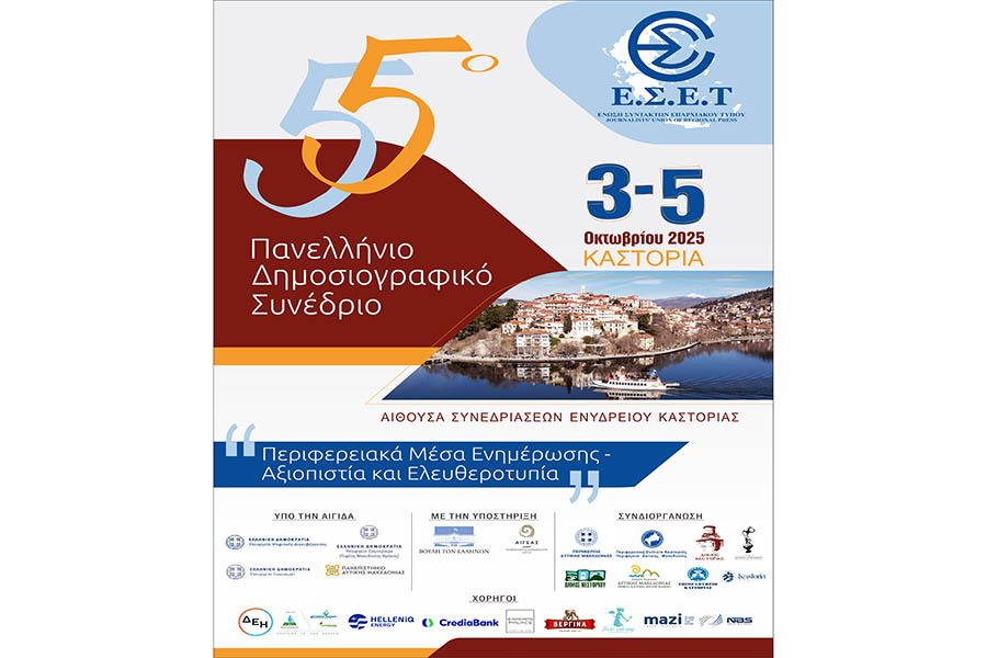 altΗ Ένωση Συντακτών Επαρχιακού Τύπου θα πραγματοποιήσει το 55ο Πανελλήνιο Δημοσιογραφικό Συνέδριό της με τίτλο «Περιφερειακά Μέσα Ενημέρωσης - Αξιοπιστία και Ελευθεροτυπία»,  3 - 5 Οκτωβρίου 2025, στην αίθουσα συνεδριάσεων του Ενυδρείου Καστοριάς.