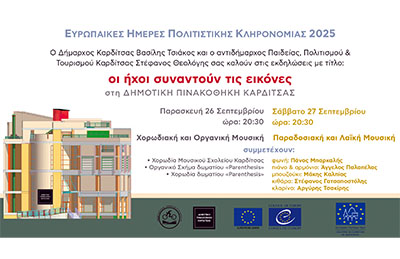Η Δημοτική Πινακοθήκη Καρδίτσας για τη συμμετοχή της επέλεξε να φιλοξενήσει στο χαρακτηριστικό, όσο και πολύπαθο κτίριό της ένα διήμερο εκδηλώσεων με τον τίτλο: οι ήχοι συναντούν τις εικόνες στη Δημοτική Πινακοθήκη Καρδίτσας (26 και 27.9.2025). Για τον σκοπό αυτό εξασφάλισε τη συνεργασία με διάφορες μουσικές ομάδες. Χορωδιακά σχήματα, μουσική δωματίου, παραδοσιακή και λαϊκή μουσική. Ποικιλία ακουσμάτων που θα συναντηθούν, θα επηρεάσουν και θα επηρεαστούν από τα οπτικά ερεθίσματα των εικαστικών έργων που εκτίθενται στην ΔΠΚ, τις φωτογραφίες του Γιώργου Κατσάγγελου με τον τίτλο: Γυναίκες του Κόσμου και την μόνιμη έκθεση της ΔΠΚ με τα έργα των καρδιτσιωτών καλλιτεχνών της παλαιότερης γενιάς. Πολυσημία συγκινήσεων για τις φίλες και φίλους της ΔΠΚ, της μουσικής και της τέχνης γενικότερα που θα επιλέξουν αυτό το διήμερο να επισκεφτούν την ΔΠΚ. Ταυτόχρονα η επιλογή αυτών των εκδηλώσεων αποτελεί και μια δήλωση από την μεριά της ΔΠΚ για τη μεγάλη επιθυμία της να φιλοξενήσει και στο μέλλον μουσικές εκδηλώσεις. Πρόκειται για ένα πειραματισμό που δεν επιθυμεί να μείνει ανενεργός.