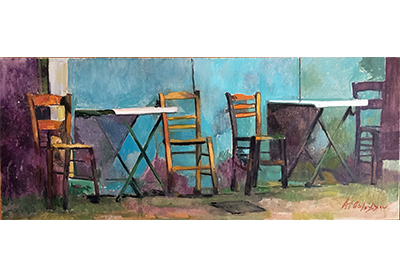 Στην εικαστική συλλογή της ΔΠΚ υπάρχουν από παλαιότερα τέσσερα (4) έργα του σημαντικού καλλιτέχνη και τα δύο από αυτά προέρχονται από την πολύτιμη δωρεά του Απόστολου Κάρκα. Στο έργο που μόλις παρέλαβε η ΔΠΚ, αποδίδεται ένα παλιό καφενείο (π. 2023, ελαιογραφία σε μουσαμά, 50 x 120 εκ.).