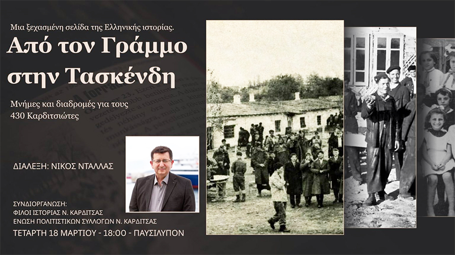 Οι Φίλοι Ιστορίας της Καρδίτσας» και η Ένωση Πολιτιστικών Συλλόγων Ν. Καρδίτσας διοργανώνουν εκδήλωση με θέμα «Από τον Γράμμο στην Τασκένδη: Μια ξεχασμένη σελίδα της ιστορίας», με στόχο την ανάδειξη μιας σημαντικής αλλά λιγότερο φωτισμένης πτυχής της νεότερης ελληνικής ιστορίας: της πολιτικής προσφυγιάς μετά τον Εμφύλιο Πόλεμο και της εγκατάστασης χιλιάδων Ελλήνων στην Τασκένδη.