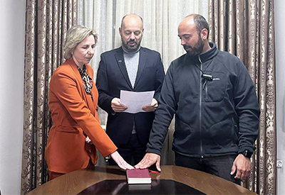Οι δύο νέοι υπάλληλοι αφού έθεσαν το χέρι τους στο Ιερό Ευαγγέλιο έδωσαν τον εξής όρκο: Ορκίζομαι να φυλλάτω πίστη στην πατρίδα, υπακοή στο Σύνταγμα και τους Νόμους κι να εκπληρώνω ευσυνειδητώς τα καθήκοντά μου”.