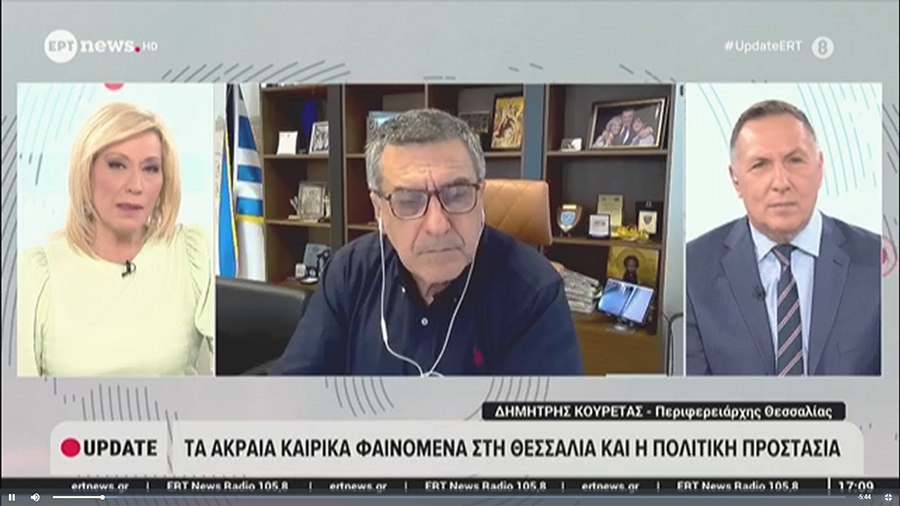 Η αξιοποίηση των νέων τεχνολογιών και της τεχνητής νοημοσύνης αποτέλεσε έναν από τους πρωταρχικούς στόχους της Περιφέρειας Θεσσαλίας στον τομέα της Πολιτικής Προστασίας, τόνισε ο Περιφερειάρχης Θεσσαλίας κ. Δημήτρης Κουρέτας σε συνέντευξή του στην ΕΡΤ NEWS και στην εκπομπή UPDATE με τους δημοσιογράφους Σταυρούλα Χριστοφιλέα και Φάνη Παπαθανασίου.