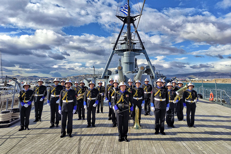 που επιβαίνουν στο πολεμικό πλοίο «ΕΛΛΑΣ» πραγματοποιούν την πρώτη εμφάνιση της Μπάντας του