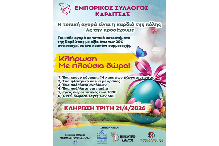 Με κάθε αγορά άνω των 20€ σε τοπικά καταστήματα , μέλη του Εμπορικού Συλλόγου Καρδίτσας , ο καταναλωτής θα δικαιούται ένα κουπόνι συμμετοχής στην κλήρωση που θα κάνει ο σύλλογος .