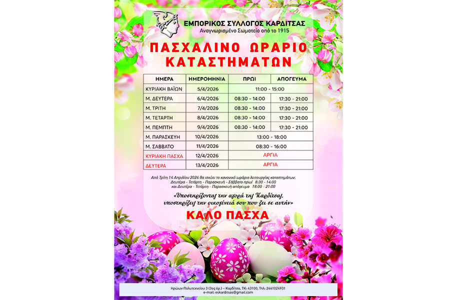 Σε εορταστικούς ρυθμούς κινείται η αγορά της Καρδίτσας ενόψει της Μεγάλης Εβδομάδας και του Πάσχα 2026, σύμφωνα με ανακοίνωση του Εμπορικού Συλλόγου.