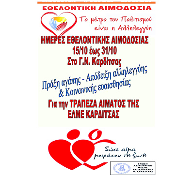 Από 15/10 έως και 31/10, στο τμήμα Αιμοδοσίας του Γενικού Νοσοκομείου Καρδίτσας