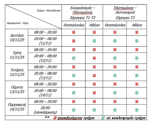 •Τρίτη 11 Νοεμβρίου 2025 απόγευμα:απόδοση σε κυκλοφορία τμήματος Ευαγγελισμός – Λεπτοκαρυά προς Θεσσαλονίκη και Λεπτοκαρυά – Πλαταμώνας προς Αθήνα (θα παραμείνει αποκλεισμένο το τμήμα Πλαταμώνας – Ευαγγελισμός προς Αθήνα).