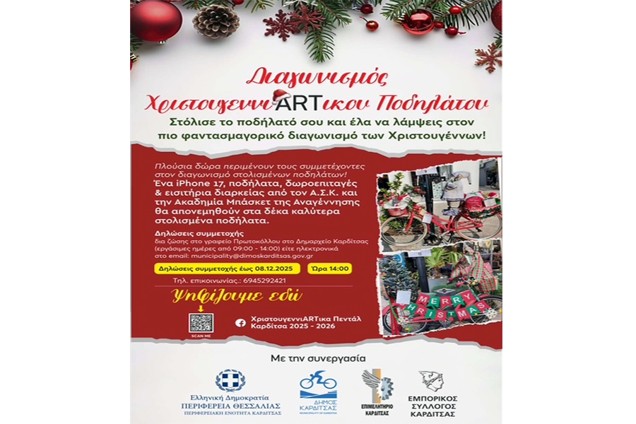 φέτος για 2η συνεχόμενη χρονιά ο διαγωνισμός ΧριστουγεννιARTικα Πεντάλ θα επαναληφθεί στην πόλη της Καρδίτσας για μικρούς και μεγάλους με πλούσια δώρα για τους νικητές!