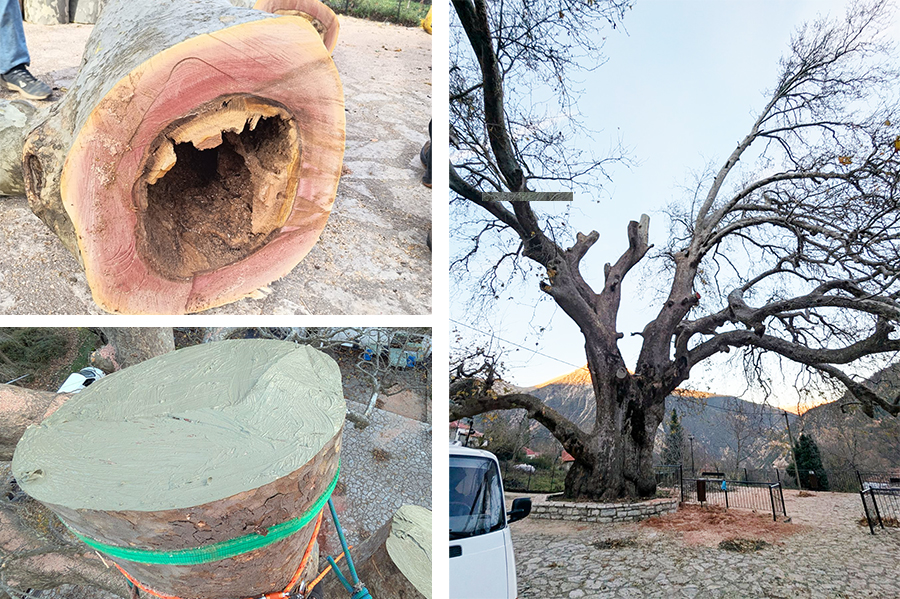Κατά τον πρόσφατο έλεγχο, διαπιστώθηκε ότι ο πλάτανος είχε προσβληθεί από το μεταχρωματικό έλκος, μια σοβαρή φυτοπαθολογική ασθένεια που απειλεί με ξήρανση τα πλατάνια της χώρας.