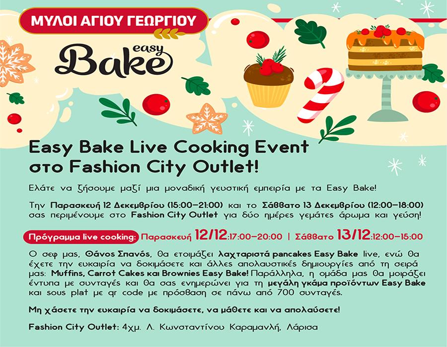 Την Παρασκευή 12 Δεκεμβρίου (17:00–20:00) και το Σάββατο 13 Δεκεμβρίου (12:00–15:00), οι μικροί μας φίλοι μπαίνουν στην πιο νόστιμη χριστουγεννιάτικη δράση με το Easy Bake Live Cooking. Ο σεφ του EasyBake από τους Μύλους Αγ. Γεωργίου ετοιμάζει λαχταριστά pancakes επί σκηνής, τα παιδιά δοκιμάζουν γλυκές δημιουργίες Easy Bake και παίρνουν μαζί τους ιδέες και έντυπα με συνταγές που μπορούν να απολαύσουν στο σπίτι με όλη την οικογένεια.