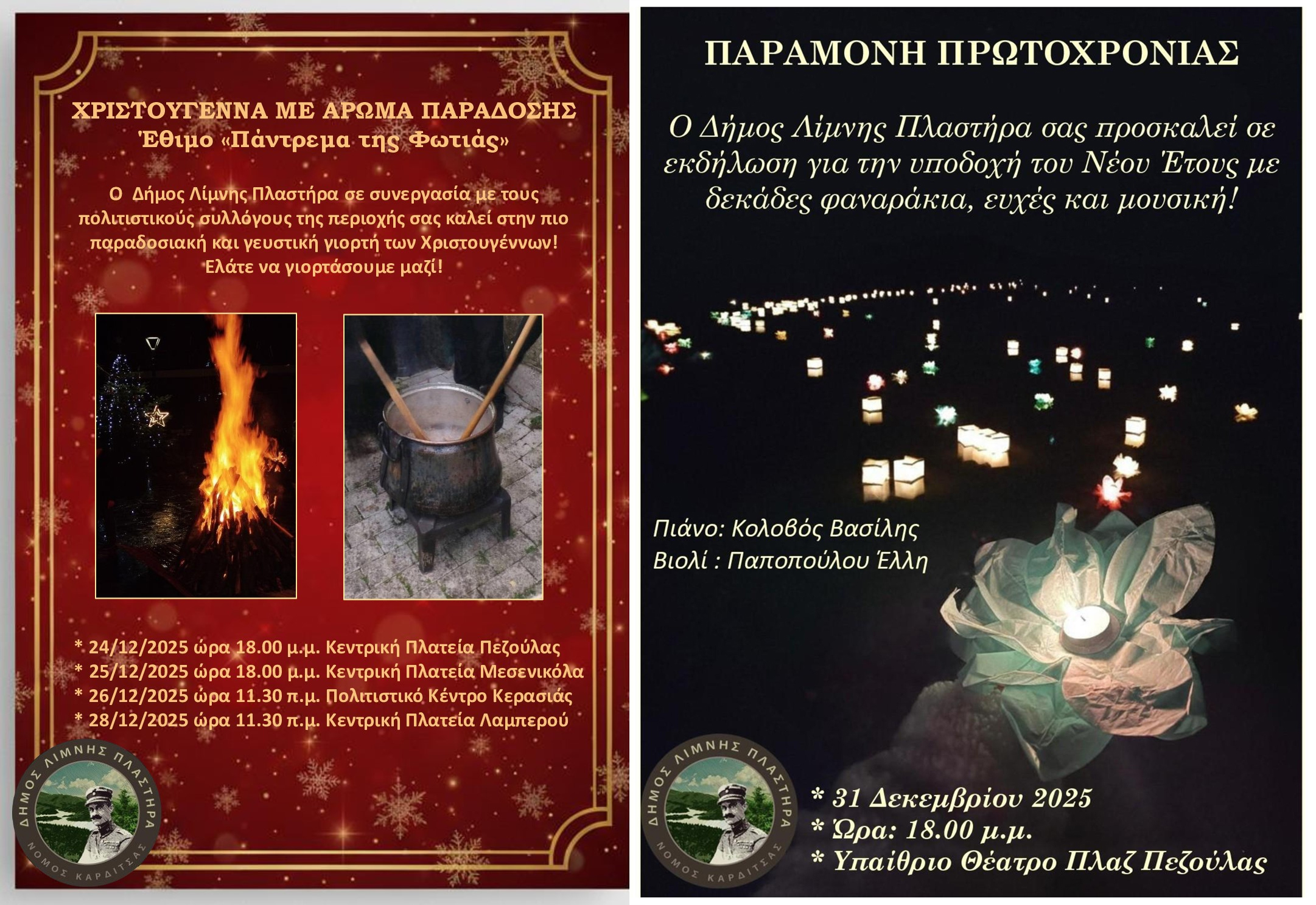 Η Λίμνη Πλαστήρα με την αυθεντική φυσική ομορφιά και την πλούσια παράδοσήτης, θα σας υποδεχθεί σε γιορτές γεμάτες φως, μαγεία και ζεστή ατμόσφαιρα. Οι εορταστικές εκδηλώσεις μας αναδεικνύουν τον πολιτισμό και τα έθιμα της περιοχής, ενώ ταυτόχρονα συμβάλλουν στην ενίσχυση του τουρισμού και της τοπικής οικονομίας.