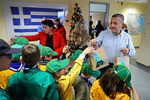 Η μέρα ξεκίνησε με τους Προσκόπους Λάρισας, τα λυκόπουλα, τους προσκόπους και τους ανιχνευτές, παιδιά του Συλλόγου (ηλικίας 8-18 ετών), που επισκέφτηκαν την Περιφέρεια Θεσσαλίας και τραγούδησαν το «Αρχιμηνιά και Αρχιχρονιά» στον Δημ. Κουρέτα, ο οποίος τους έκανε ερωτήσεις για τον Άγιο Βασίλη για να καταλήξει να τους παροτρύνει να πιστεύουν στη μαγεία των Χριστουγέννων και να ονειρεύονται. Τους Προσκόπους συνόδευαν ο Πάρης Μακρής, βοηθός περιφερειακού εφόρου, ο Γιώργος Καλογεράς και ο Θεόδωρος Πιτένης.