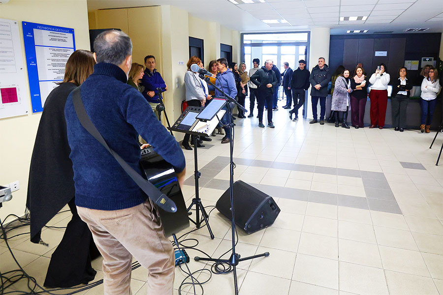 Ο Περιφερειάρχης Θεσσαλίας, Δημήτρης Κουρέτας, επεφύλαξε σήμερα μια ευχάριστη πρωτοχρονιάτικη έκπληξη στους εργαζόμενους της Περιφέρειας στο Διοικητήριο της Λάρισας. Αντί για τις τυπικές ευχές, επέλεξε να δώσει έναν πιο ζεστό και ανθρώπινο τόνο στην τελευταία μέρα του χρόνου, προσκαλώντας τους μουσικούς Άκη Ρεστέμη (κιθάρα) και Αφροδίτη Χαρμπαντίδου (τραγούδι) να διασκεδάσουν όσους εργάζονταν μέχρι και σήμερα.