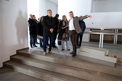 Κατά την ξενάγηση που πραγματοποίησε η επιβλέπουσα μηχανικός του Δήμου κα Σοφία Ρωμανάσου,οι κ.κ. Κουρέτας, Μαμάκος ενημερώθηκαν ότι αυτή τη στιγμή πραγματοποιούνται εργασίες στην αίθουσα των θεατών, που είναι πολύ κομβικές για το κτίριο, καθώς μετά την ολοκλήρωσή τους θα επιτραπεί να προχωρήσουνε τα συνεργία στις λοιπές εργασίες. Οι τρέχουσες ηλεκτρομηχανολογικές εργασίες αφορούν στο θόλο της αίθουσας των θεατών, ο οποίος θα καλυφθεί με ξύλινη επένδυση με την αποπεράτωσή τους. Το επόμενο στάδιο των εργασιών αφορά στην τοποθέτηση του δαπέδου της αίθουσας των θεατών και των καθισμάτων, καθώς και του δαπέδου της σκηνής. Η κα Ρωμανάσου διευκρίνισε ότι έχουν από πέρυσι ολοκληρωθεί οι εργασίες που αφορούσαν στο αναβατόριο της σκηνής, τον μηχανισμό του περιστρεφόμενου τμήματος αυτής, οι οποίοι έχουν ελεγχθεί ως προς τη λειτουργία τους και πιστοποιηθεί. Μετά την ολοκλήρωση των ξύλινων επενδύσεων στην αίθουσα των θεατών και στη σκηνή, θα ακολουθήσουν εργασίες τελικών επενδύσεων στα δύο φουαγιέ, καθώς και λοιπές μικροεργασίες τελικού σταδίου.