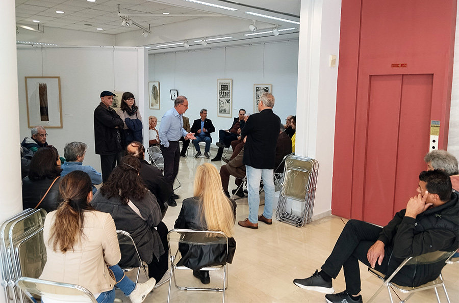 Μια ξενάγηση και μια ανοιχτή συνομιλία για τις σχέσεις Ζωγραφικής και Χαρακτικής υπήρξε το δέλεαρ για τη σύναξη αυτή. Η υπάλληλος της ΔΠΚ Μαρία Γιαννέλου σκιαγράφησε το χρονικό της μακρόχρονης συνεργασίας μεταξύ της ΔΠΚ και της Εταιρεία Εικαστικών Τεχνών Α. ΤΑΣΣΟΣ με την παρούσα έκθεση να αποτελεί την τρίτη της εκδήλωση. Ο κ. Μάνος Στεφανίδης, ιστορικός τέχνης και πρόεδρος της Καλλιτεχνικής Επιτροπής της ΔΠΚ φώτισε σημεία από την ιστορία της χαρακτικής, μίλησε για σημαντικούς εκπροσώπους της τέχνης αυτής στην Ελλάδα, ανέδειξε τη στενή συνάφεια αλλά και τα σημεία απόκλισης της ζωγραφικής και της χαρακτικής. Το μέλος της Καλλιτεχνικής Επιτροπής κ. Άκης Κοτρώτσιος και ο κ. Δημήτρης Βάλλας, ζωγράφοι και οι δύο, κατέθεσαν τις εμπειρίες τους από πειραματισμούς πάνω στην τέχνη της χαρακτικής. Ιδιαίτερο ενδιαφέρον είχε η παρουσία στην εκδήλωση των χαρακτριών κ. Χριστίνας Αγγέλου και κ. Μαρίας Γκαλιάτα που και οι δύο μυήθηκαν στη χαρακτική κατά την μαθητεία τους σε Σχολές Καλών Τεχνών. Αναφέρθηκαν με θέρμη στην μαγεία που εισπράττουν από την ενασχόληση με την τεχνολογία της χαρακτικής, αλλά και τις πρακτικές δυσκολίες που αντιμετωπίζουν ως ενεργές καλλιτέχνιδες. Στην Ελλάδα, υπάρχουν ελάχιστα οργανωμένα εργαστήρια χαρακτικής όπου οι ελεύθεροι καλλιτέχνες μπορούν να τυπώσουν έργα τους, γεγονός που λειτουργεί ανασταλτικά προς την ανάπτυξη της τέχνης αυτής. Ένας τόνος αισιοδοξίας προστέθηκε από την αυτοδίδακτη στη χαρακτική αλλά και ενθουσιώδη SOURTOUKA που την αξιοποιεί στην δουλεία της, όπως και ο JOLA που την έχει διδαχτεί και την υπηρετεί μέσω των γραφικών τεχνών. Απορίες και σκέψεις για την λειτουργία των πολλαπλών, τη σχέση της χαρακτικής με την φωτογραφία, αναφορά στο βιβλίο του Βάλτερ Μπένγιαμιν ‘’Το έργο τέχνης στην εποχή της τεχνικής αναπαραγωγιμότητάς του’’ και τον εκδημοκρατισμό της τέχνης μέσω της χαρακτικής. Μνήμες από την κοινή έκθεση με έργα των Α. ΤΑΣΣΟΥ και Δ. Γιολδάση από την Λαϊκή Βιβλιοθήκη ‘’Η ΑΘΗΝΑ’’, περίπου έξι δεκαετίες παλιότερα και η προσωπική γνωριμία του κ. Απόστολου Πίτσαβου με τον σημαντικό χαράκτη.