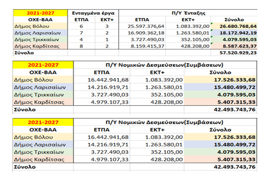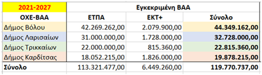 Ο συνολικός προϋπολογισμός των ΣΒΑΑ των 4 πρωτευουσών των ΠΕ Θεσσαλίας
