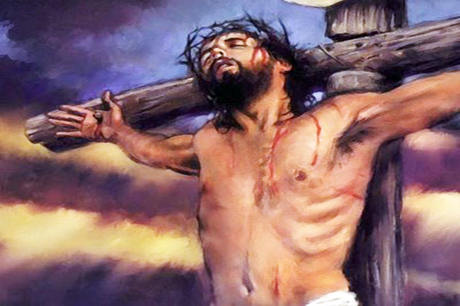 Μετά, φορώντας πάλι τα ρούχα του και βαστάζοντας το Σταυρό, πηγαίνει προς τον Γολγοθά, τον τόπο της καταδίκης και εκεί, γύρω στην Τρίτη ώρα της ημέρας, σταυρώνεται μεταξύ δυο ληστών, βλασφημείται από αυτούς που είχαν πάει στον Γολγοθά μαζί του, μυκτηρίζεται από τους αρχιερείς, ποτίζεται από τους στρατιώτες με ξύδι ανακατεμένο με χολή. Γύρω στην ενάτη ώρα, αφού βγάζει πρώτα φωνή μεγάλη, και λέει: «Τετέλεσται», εκπνέει «ο αμνός του Θεού, ο αίρων την αμαρτίαν του κόσμου».