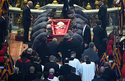 Ένα «ποτάμι» από λευκοντυμένους ιερείς μεταφέρουν το ξύλινο φέρετρο διασχίζοντας την πλατεία, κατευθυνόμενοι προς τη Βασιλική του Αγίου Πέτρου, υπό το άγρυπνο βλέμμα της Ελβετικής φρουράς του Βατικανού.