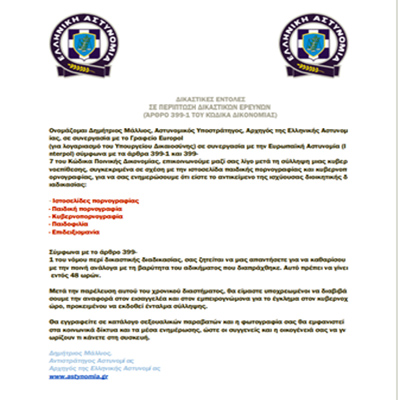 Συγκεκριμένα, οι δράστες χρησιμοποιώντας τα στοιχεία αυτά σε επιστολή δήθεν αρμόδιων ελεγκτικών Aρχών, προσπαθούν να εξαπατήσουν πολίτες – χρήστες του διαδικτύου, με το πρόσχημα ότι ο αποδέκτης τους εμπλέκεται σε υπόθεση παιδικής πορνογραφίας και άλλων αδικημάτων.