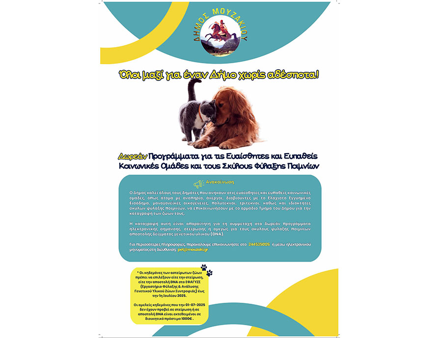 Ο Δήμος Μουζακίου καλεί όλους τους δημότες που ανήκουν στις ευαίσθητες και ευπαθείς κοινωνικές ομάδες, όπως άτομα με αναπηρία, άνεργοι, διαβιούντες με το Ελάχιστο Εγγυημένο Εισόδημα, μονογονεϊκές οικογένειες, πολύτεκνοι, τρίτεκνοι, καθώς και ιδιοκτήτες σκύλων φύλαξης ποιμνίων, να επικοινωνήσουν με το αρμόδιο Τμήμα του Δήμου για την καταγραφή των ζώων τους.