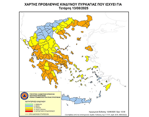 Όπως προβλέπεται με τον Ημερήσιο Χάρτη Πρόβλεψης Κινδύνου Πυρκαγιάς της Γενικής Γραμματείας Πολιτικής Προστασίας, στην Περιφέρεια Θεσσαλίας, για την Τετάρτη 13 Αυγούστου 2025, προβλέπεται Κατηγορία Κινδύνου 3 (υψηλή) για όλη την Περιφέρεια Θεσσαλίας και Κατηγορία Κινδύνου 4 (πολύ υψηλή) για τις Σποράδες.