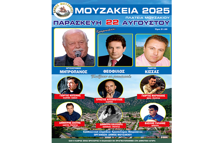 Ο Δήμος Μουζακίου σε συνεργασία με τον Αρχαιολογικό, Λαογραφικό, Πολιτιστικό Σύλλογο Μουζακίου «Οι Γόμφοι», διοργανώνουν τα καθιερωμένα ΜΟΥΖΑΚΕΙΑ 2025, που θα πραγματοποιηθούν την Παρασκευή 22 Αυγούστου 2025 και ώρα 21:00 στην κεντρική πλατεία Μουζακίου. Πρόκειται για έναν κορυφαίο θεσμό της τοπικής πολιτιστικής ζωής, που κάθε χρόνο συγκεντρώνει πλήθος επισκεπτών και φίλων της μουσικής.