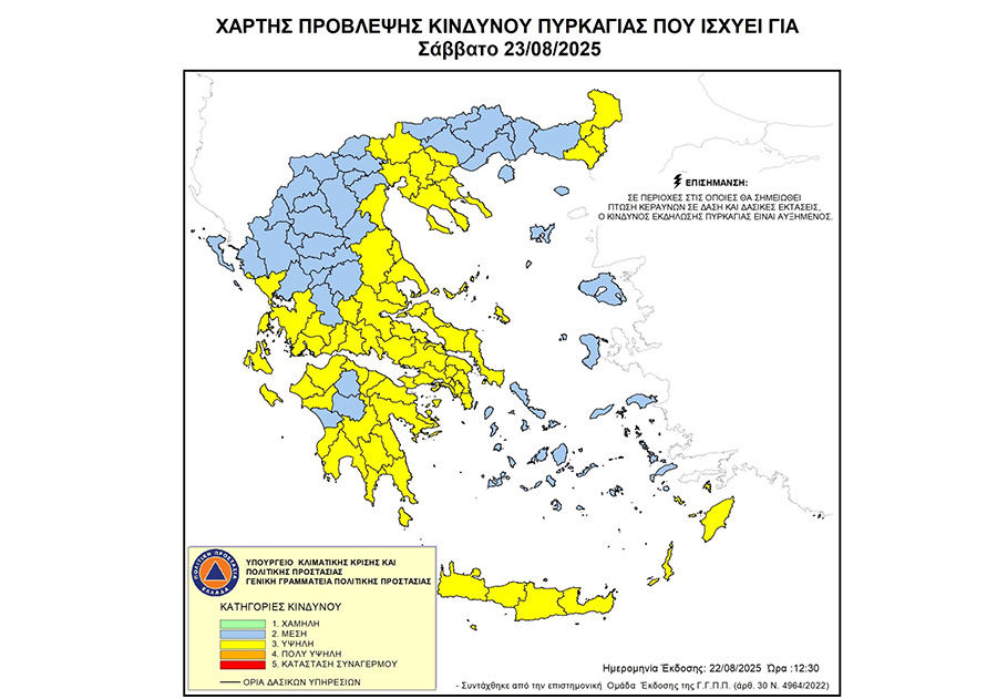 Υψηλός είναι ο κίνδυνος εκδήλωσης πυρκαγιάς για σήμερα Σάββατο 23/08 (κατηγορία 3) στην Περιφέρεια Αττικής, σύμφωνα με τον Χάρτη Πρόβλεψης Κινδύνου Πυρκαγιάς που εξέδωσε η Γενική Γραμματεία Πολιτικής Προστασίας.