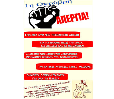 Την Τετάρτη 1 Οκτώβρη απεργούν οι εργαζόμενοι και στον δημόσιο και στον ιδιωτικό τομέα. ΑΠΕΡΓΟΥΜΕ και οι εκπαιδευτικοί. Ενώνουμε τις φωνές μας με τη φωνή όλων των εργαζομένων, των γονιών, των μαθητών μας, των νέων, ενάντια στον νέο εργασιακό μεσαίωνα με τα 13ωρα και τις εξοντωτικές συνθήκες εργασίας. Για τη συλλογική διεκδίκηση ζωής με δικαιώματα.