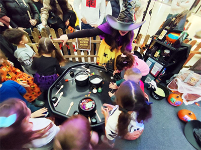 Το απόγευμα, οι δραστηριότητες συνεχίστηκαν με Messy Play & Ξυλοπόδαρο Show, χαρίζοντας στα παιδιά μια ανεπανάληπτη εμπειρία. Μικροί μάγοι και μάγισσες έπλασαν «μαγικά φίλτρα», βούτηξαν τα χέρια τους σε πολύχρωμες «γλίτσες» και «μάτια τεράτων» και δημιούργησαν τις δικές τους Halloween συνταγές γεμάτες φαντασία. Την ίδια στιγμή, ο εντυπωσιακός ξυλοπόδαρος φωτογραφιζόταν με τα παιδιά, σκορπίζοντας γέλιο και χαρά σε κάθε του βήμα.