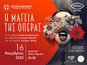 Η Περιφέρεια Θεσσαλίας διοργανώνει μια μοναδική μουσική βραδιά με διάσημα τραγούδια από δημοφιλείς όπερες και μιούζικαλ στις 16 Νοεμβρίου στις 8.30 το βράδυ στο Δημοτικό Ωδείο Λάρισας, σε συνεργασία με την Αντιδημαρχία Πολιτισμού του Δήμου Λαρισαίων.