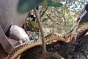 Ο άνδρας έριξε νερό με λάστιχο στο δέντρο πάνω στο οποίο ήταν η δεντρογαλιά. Το φίδι με μανία ήπιε το νερό δείχνοντας φανερά διψασμένο.
