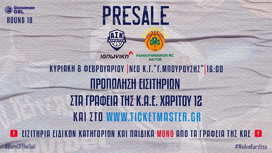Γι’ αυτό το λόγο, ο Α.Σ. Καρδίτσας ΙΑΠΩΝΙΚΗ έχει ξεκινήσει τη διαδικασία προπώλησης των εισιτηρίων, τα οποία κάθε φίλαθλος μπορεί από τη Δευτέρα 19 Ιανουαρίου να τα προμηθευτεί, τόσο από τα γραφεία της ομάδας (οδός Ν. Χαρίτου 12, ισόγειο), Δευτέρα-Τετάρτη-Παρασκευή 9-1 το πρωί και 6-9 το απόγευμα, Τρίτη-Πέμπτη 9-1 το πρωί και Σάββατο 10-1 το πρωί, όσο και από την ηλεκτρονική πλατφόρμα www.ticketmaster.gr.