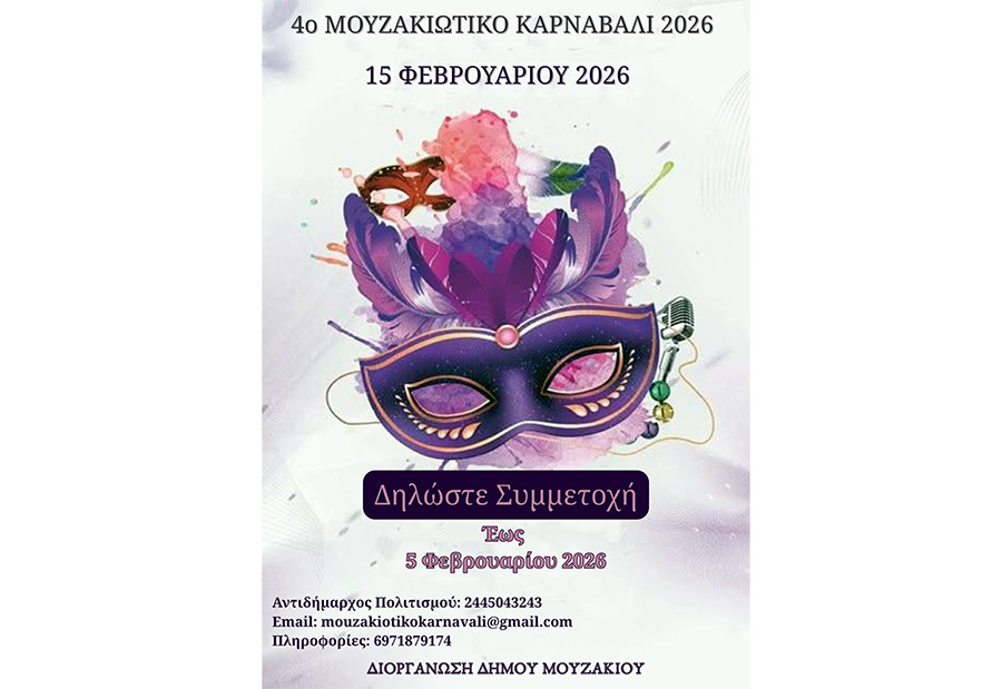 Την Κυριακή 15 Φεβρουαρίου 2026 ο Δήμος Μουζακίου διοργανώνει το 4ο Μουζακιώτικο Καρναβάλι και σας προσκαλεί να συμμετέχετε στη μεγάλη αποκριάτικη γιορτή της πόλης μας!