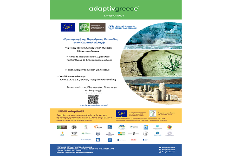 Την Πέμπτη 5 Μαρτίου στις 9.00 θα πραγματοποιηθεί η 11η Περιφερειακή ενημερωτική ημερίδα για την προσαρμογή της Περιφέρειας Θεσσαλίας στην κλιματική αλλαγή. Η ημερίδα διοργανώνεται με την επιμέλεια της Ένωσης Περιφερειών Ελλάδας (ΕΝ.Π.Ε.), της Κεντρικής Ένωσης Δήμων Ελλάδας (Κ.Ε.Δ.Ε.) και της Ελληνικής Εταιρίας Περιβάλλοντος και Πολιτισμού (ΕΛΛΕΤ), σε συνεργασία με την Περιφέρεια Θεσσαλίας.