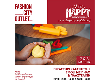 Ο Μάρτιος στο Fashion City Outlet γεμίζει χρώμα, φαντασία και παιδικά χαμόγελα με τα Happy Family Weekends — μια σειρά δημιουργικών εργαστηρίων για παιδιά που θα πραγματοποιούνται κάθε Σαββατοκύριακο, 12:00–14:00 & 17:30–19:30, με ελεύθερη είσοδο.