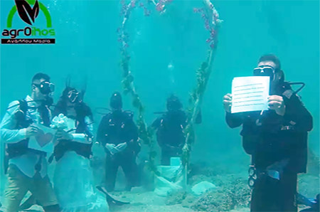 Η Μυρτώ με καταγωγή από την Έδεσσα και ο Πέτρος με καταγωγή από την Κομοτηνή ενώθηκαν με τα δεσμά του γάμου το βράδυ της Δευτέρας 29 Αυγούστου 2022 σε βάθος 5 μέτρων στον εντυπωσιακό βυθό της παραλίας Ρουσούμ Γιαλό της Αλοννήσου.