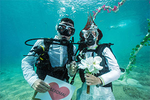 Σημειώνεται πως ο πρώτος υποβρύχιος γάμος πραγματοποιήθηκε τον περασμένο Αύγουστο, ανοίγοντας τον δρόμο σε μια νέα υπηρεσία για την οποία ήδη υπάρχει ζήτηση για προγραμματισμό νέων γάμων στο εξωτικό νησί των Σποράδων το φετινό καλοκαίρι. «Προκειμένου να δώσουμε το κίνητρο στα νέα ζευγάρια να ανταλλάσσουν όρκους αιώνιας αγάπης στο βυθό μας, έχουμε συνεννοηθεί με καταδυτικά κέντρα του νησιού ώστε να παρέχονται δωρεάν ο καταδυτικός εξοπλισμός καθώς και τα απαραίτητα μαθήματα εκπαίδευσης στους μελλόνυμφους. Ο υποβρύχιος γάμος είναι μια βιώσιμη μοναδική εμπειρία με μηδαμινά κόστη. Η ανταπόκριση των ζευγαριών είναι ενθαρρυντική και δικαιώνει την προσπάθεια μας για τη δημιουργία μιας νέας γαμήλιας αγοράς», δήλωσε ο κ. Βαφίνης. Συμπληρωματικά με τους υποβρύχιους γάμους ή και ανεξάρτητα από τον τύπο του γάμου, ο προορισμός ενθαρρύνει και τη διεξαγωγή υποβρύχιων γαμήλιων φωτογραφίσεων, καθώς τα αποτελέσματα από το πρώτο “άλμπουμ” υποβρύχιου γάμου ξεχωρίζουν.