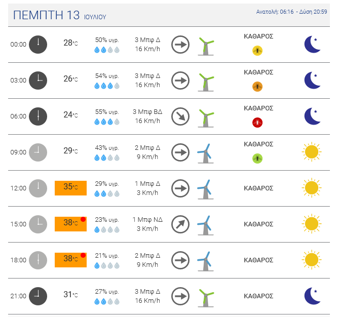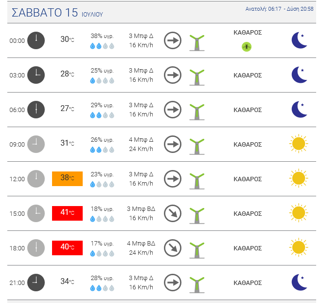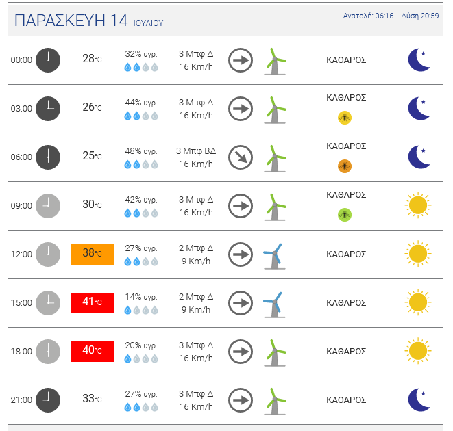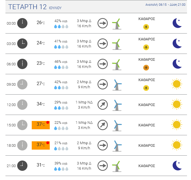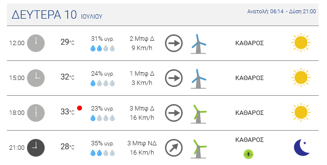 Ηλιοφάνεια αναμένεται σήμερα Δευτέρα 10 Ιουλίου 2023. Άνεμοι έως 6 μποφόρ στα Δωδεκάνησα. Υψηλές θερμοκρασίες θα σημειωθούν από σήμερα μέχρι τέλος της εβδομάδας, με το θερμόμετρο να χτυπάει «κόκκινο» τις επόμενες ημέρες.